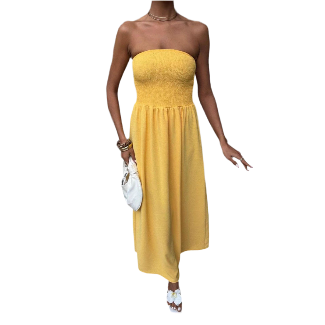 SolBliss – Axelbandslös Smock Midiklänning är den ultimata sommarklänningen för en luftig och feminin look. Den elastiska smocktoppen sitter bekvämt och stadigt utan axelband, medan den långa, flödande midilängden ger en elegant rörelse. En perfekt kombination av skönhet och bekvämlighet som får dig att känna dig självsäker i varje steg.